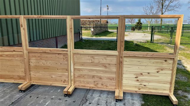 Hondenschool de Laar uit Bemmel beschikt over een ruime binnen- en buitenlocatie waar hondentrainingen worden gegeven. Om meer beschutting tegen de wind te krijgen hebben ze onlangs verschillende terrasschermen neergezet. Deze terrasschermen zijn gemaakt van douglashout met gelaagd glas en staan op wielen. Hierdoor zijn de schermen ook weer eenvoudig verplaatsbaar.
