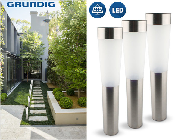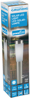 Een roestvrijstalen solarlamp is ideaal als tuinlicht om overal rondom uw huis te plaatsen. Deze lamp van het merk Grundig heeft een LED lamp met 2 witte power LED's en een lichtopbrengst van wel 4-5 lumen.