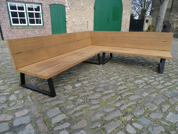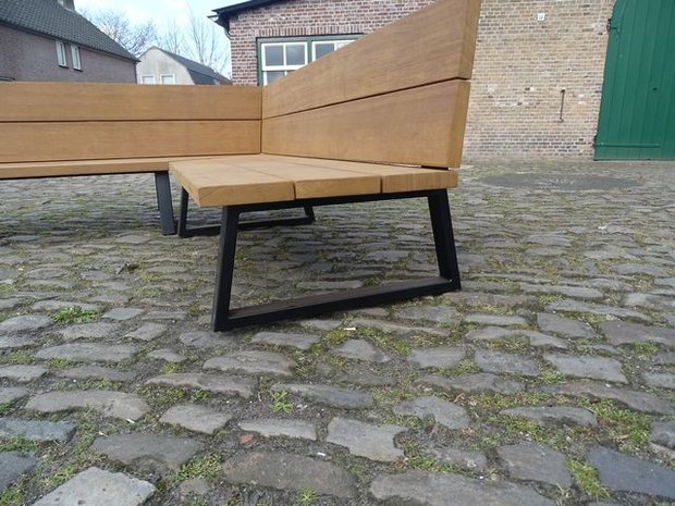 De TW Delft houten hoekbank is ideaal voor uw tuin of terras. Geniet van deze stijlvol vormgegeven blikvanger die we helemaal naar uw wens maken. Met deze comfortabele tuin hoekbank kunt u heerlijk ontspannen en tot rust komen in uw tuin. Deze hoekbank is opgebouwd uit sfeervol hardhout met een stevig stalen onderstel. Het verzinkt stalen onderstel heeft een poedercoating in de kleur zwart. De zinklaag en poedercoating beschermen het staal tegen roestvorming, waardoor het ideaal is voor buitengebruik. Door de combinatie van staal met hardhout heeft de hoekbank een stoere en industriële uitstraling. Kiest u voor deze tuin hoekbank, dan kiest u voor kwalitatief Nederlandse vakmanschap en door het gebruik van duurzame materialen is dit voor een product waar u jaren van kunt genieten. De tuin hoekbank is ook te combineren met een bijpassende tafel van hardhout met staal.