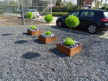 De plantenbakken worden op bestelling voor u gemaakt, zodat u er zeker van kunt zijn dat u een nieuwe en speciaal voor u gemaakte plantenbak ontvangt. Een nieuwe plantenbak wordt altijd standaard als blank, niet tot weinig verkleurd, staal geleverd. Wij adviseren om de plantenbak in een vochtige omgeving te zetten, waar deze na enkele weken in het laatste kleurstadium zal zitten en het resultaat van cortenstaal zal bereiken. Dankzij dit natuurlijke roestproces is geen één vierkante cortenstaal plantenbak precies hetzelfde. Komt u de gewenste afmeting niet tegen? Stuur ons een berichtje en wij informeren u graag over de mogelijkheden van een maatwerk plantenbak!