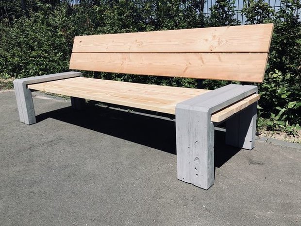 Douglashout is een duurzaam houttype wat vers een warme, robuuste en authentieke kleur heeft. De materialen gemaakt van deze houtsoort scheuren van nature iets sneller en kunnen wankanten bevatten. Douglashout is een houtsoort die sneller verkleurt en kan onbehandeld blijven. Naarmate de tuinbank wat langer buiten staat zal deze kleur snel veranderen naar een lichte kleur en vervolgens natuurlijk vergrijzen. Als u een tuinbank buiten heeft staan zal deze altijd gevoelig zijn voor de verschillende weersomstandigheden. Onder invloed van temperatuurswisselingen en verandering in luchtvochtigheid gaat hout werken. Het hout kan hierdoor gaan scheuren, kromtrekken, uitzetten en zelfs hol of bol gaan staan. Kleurveranderingen treden op en er is een kans dat hout gaat bloeden waardoor er vlekken op tegels kunnen ontstaan. Het is belangrijk om te weten dat hout leeft en niet stil staat, waarbij er ook geen voorspelling te maken is wanneer de werking van het hout zich kan uiten, wat dus ook in korte tijd kan ontstaan. Hierdoor kunnen wij dan ook geen garantie geven op eventuele vervorming, kromtrekken, scheuren, bloeden of kleurverandering van het hout. Het verschil in kleur, tekening en structuur geeft het hout juist dat mooie natuurlijke karakter. Wij vinden dat eventuele oneffenheden, noesten en scheuren daar ook zeker bij horen. Hout is een levendig product en heeft een warme uitstraling dat in de loop der jaren alleen maar mooier wordt. Om de originele kleur te behouden en het hout te beschermen tegen weersinvloeden adviseren wij u om de tuinbank te onderhouden met een olie. Hout is natuurlijk en iedere plank is uniek van kleur en structuur. Hierdoor is geen bank hetzelfde en zal deze afwijken van de voorbeeldafbeeldingen op de website. Door hout te combineren met beton krijgt de bank een opvallende en robuuste uitstraling. Een zware tuinbank van beton met hout zal niet snel omwaaien, maar is hierdoor ook niet snel te verplaatsen. Beton is enorm sterk in het opvangen van drukkrachten. In het opvangen van trekkrachten en stoten presteert beton minder. Advies is daarom om voorzichtig te zijn met het verplaatsen van een stenen bank. Iedere poot heeft een unieke eigen tekening en de poten kunnen in nuance verschillen. Het kan erop lijken dat de poten niet exact dezelfde kleur hebben. Geduld is hierbij gewenst, want meestal worden de kleurverschillen een stuk minder als deze buiten staan onder invloed van de weersomstandigheden. Beton is heel goed schoon te maken. We adviseren om dit niet te doen met een hogedrukspuit. Als u deze wel wilt gebruiken dan minimaal 10 cm van het element af.